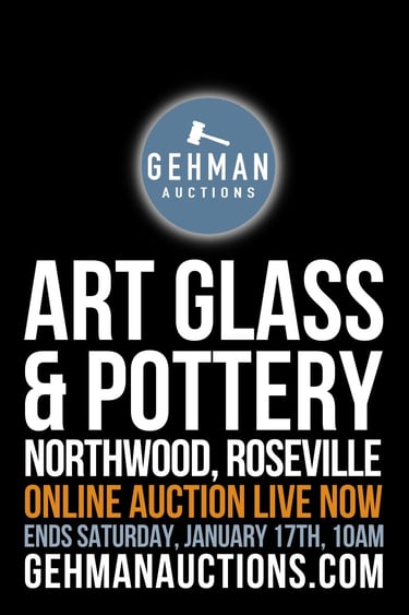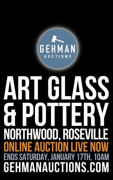 AUCTION INCLUDES OVER 350+ LOTS OF VARIOUS ART GLASS & ART POTTERY. HIGHLIGHTS INCLUDES: MULTIPLE NORTHWOOD PUNCH BOWL SETS, TWO MASTER NORTHWOOD PUNCH BOWL SETS, VARIOUS COMPOTES AND BOWLS. VARIOUS STEUBEN ART GLASS, NICE SELECTION OF ROSEVILLE FUTURA ART POTTERY, BRUSH McCOY ART DECO POTTERY AND MUCH MORE.