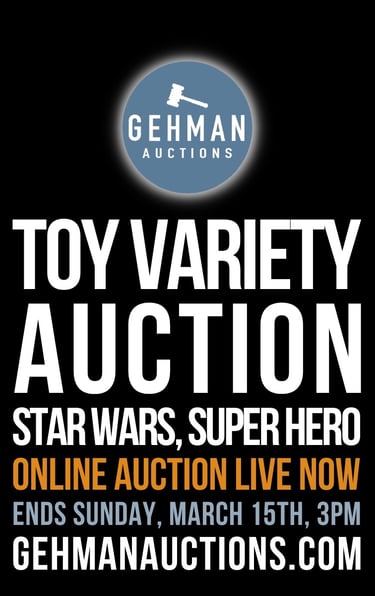 GEHMAN AUCTIONS HOSTS MULTIPLE HIGH QUALITY AUCTIONS EACH WEEK - THOUSANDS OF DIFFERENT LOTS INCLUDING: VINTAGE & MODERN TOYS, COMIC BOOKS, DIECAST, SPORTS CARDS & MEMORABILIA, LEAD TOY SOLDIERS, ANTIQUES, GLASSWARE, MILITARY, MUSIC AND NUMEROUS SPECIALTY COLLECTIONS & VARIETY AUCTIONS.